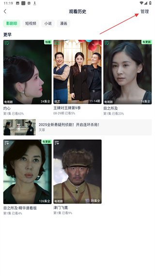 3、进入观看历史的页面内,点击右上方管理的按钮。