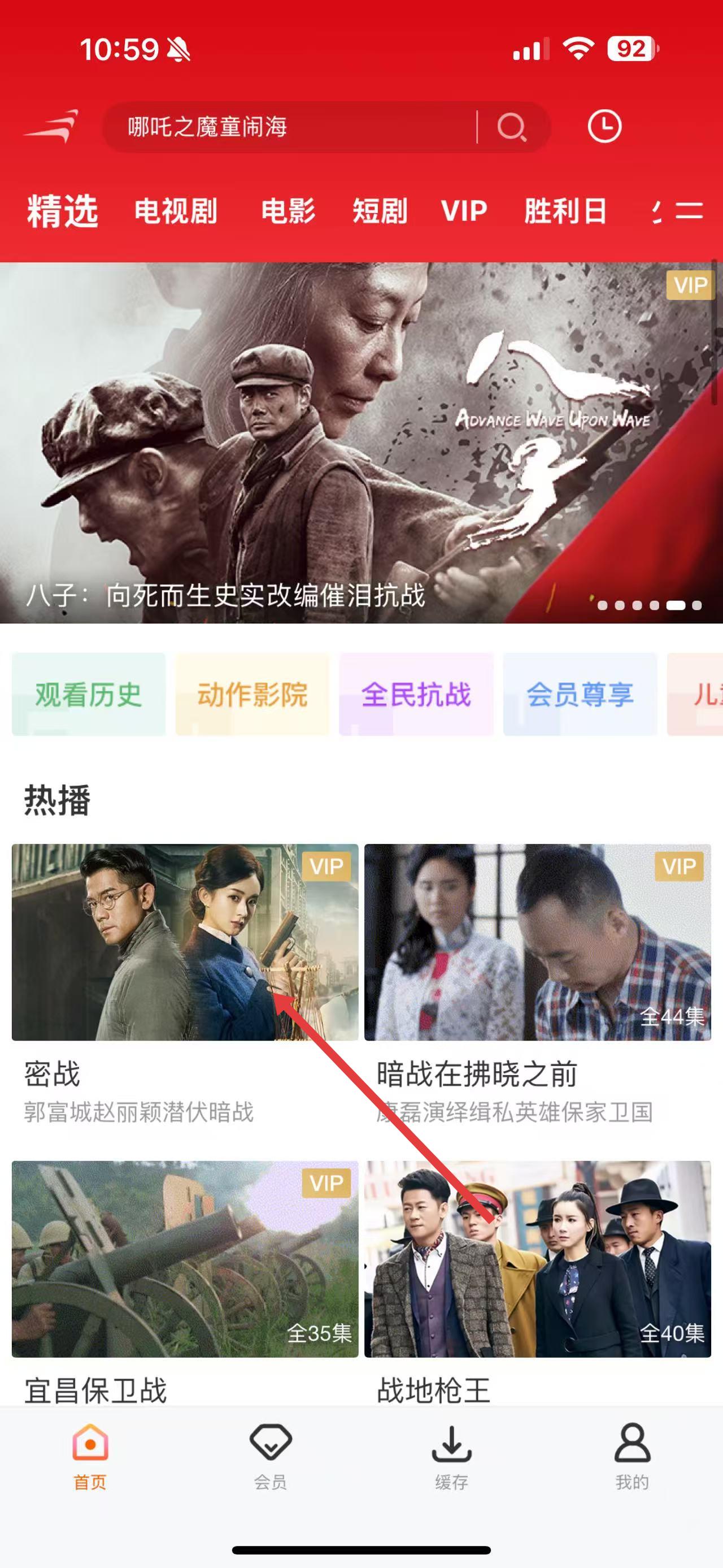1、打开风行视频APP,在首页浏览热播等栏目,选择想要投屏观看的视频,如密战。