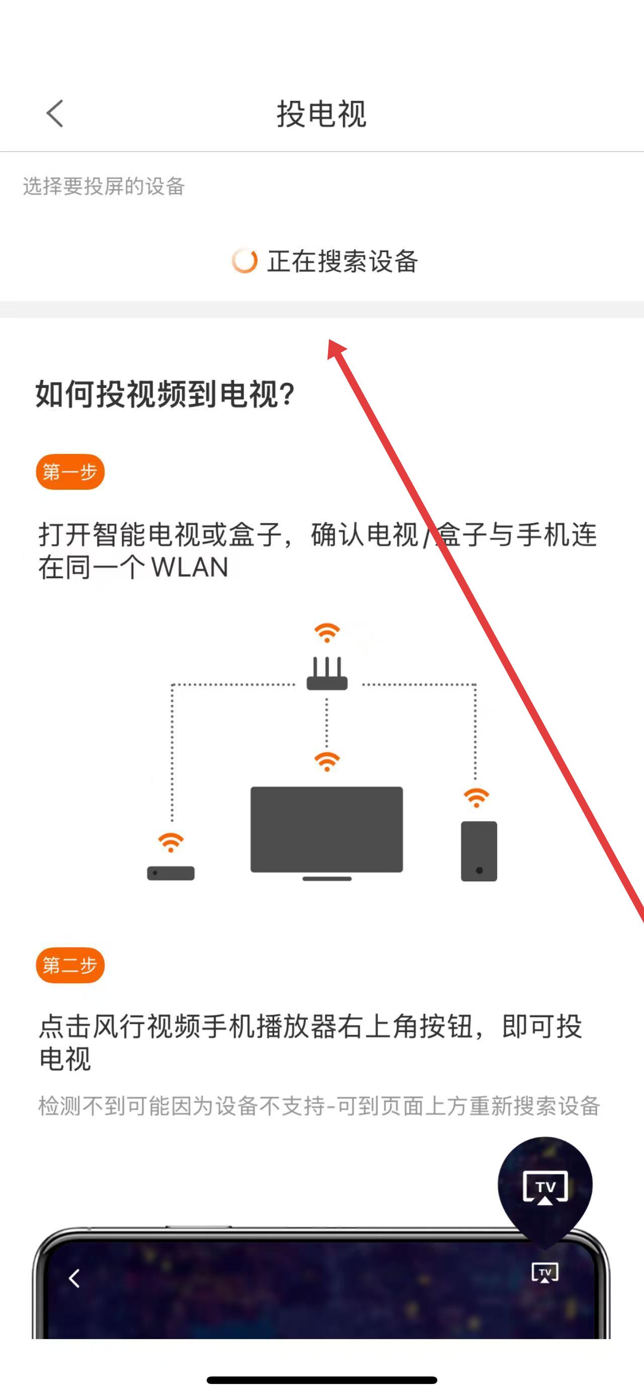 3、确保智能电视或盒子与手机连接在同一个WLAN,在投电视页面等待搜索出投屏设备后,点击选择对应设备即可完成投屏。