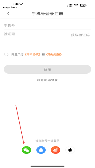 3、进入登录注册的页面内,在下方找到并点击微信图标。