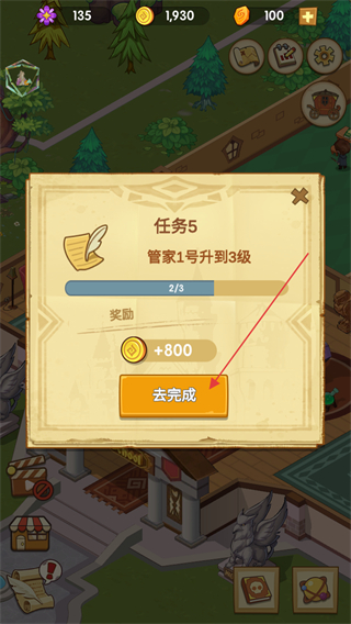 3、点击任务5弹窗中的去完成按钮,接取管家1号升到3级的任务。