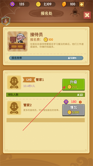 4、进入报名处界面,点击管家1右侧的升级按钮,消耗金币提升其等级。