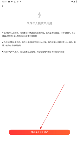 4、在未成年人模式的页面内,熟知后点击开启的按钮即可。