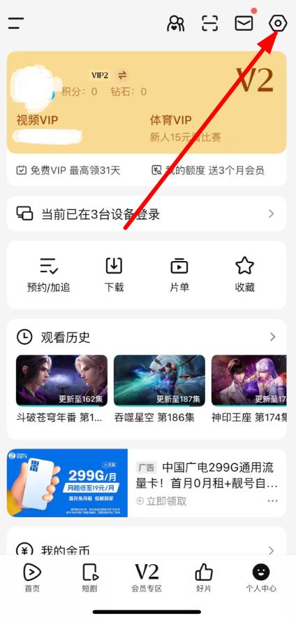 1、打开腾讯视频APP点击个人中心进入,点击界面右上角设置图标进入设置页面。