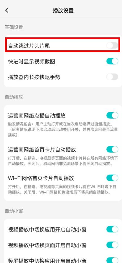 3、在播放设置界面的基础设置栏下,找到自动跳过片头片尾选项,点击关闭右侧开关即可关闭该功能。