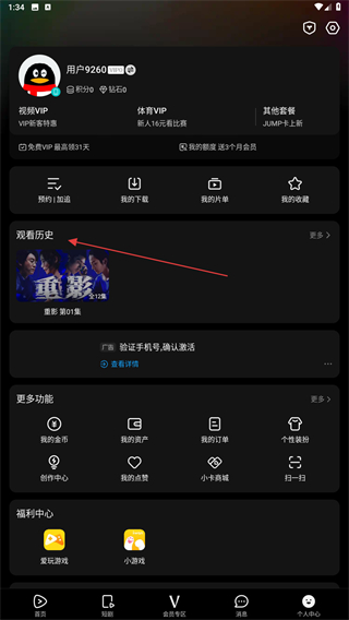 2、进入个人中心的页面内,点击观看历史的按钮。