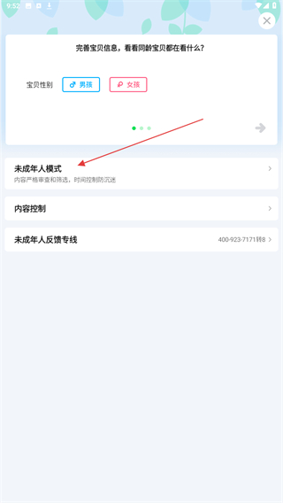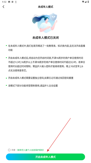 5、了解该模式后,点击开启未成年人模式即可成功。