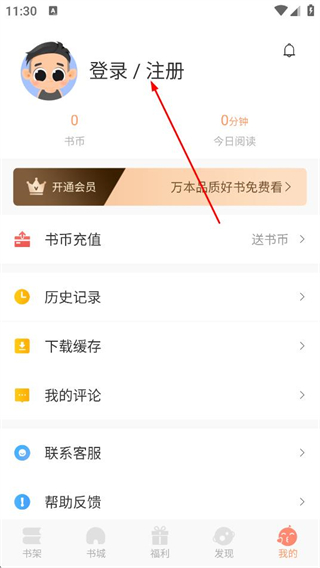1、在漫画书城首页,点击底部导航栏的我的,进入个人中心页面。