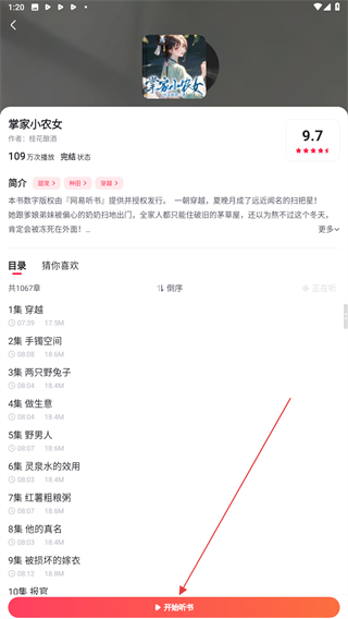 3、进入该小说的详情页面内,点击下方开始听书的按钮。