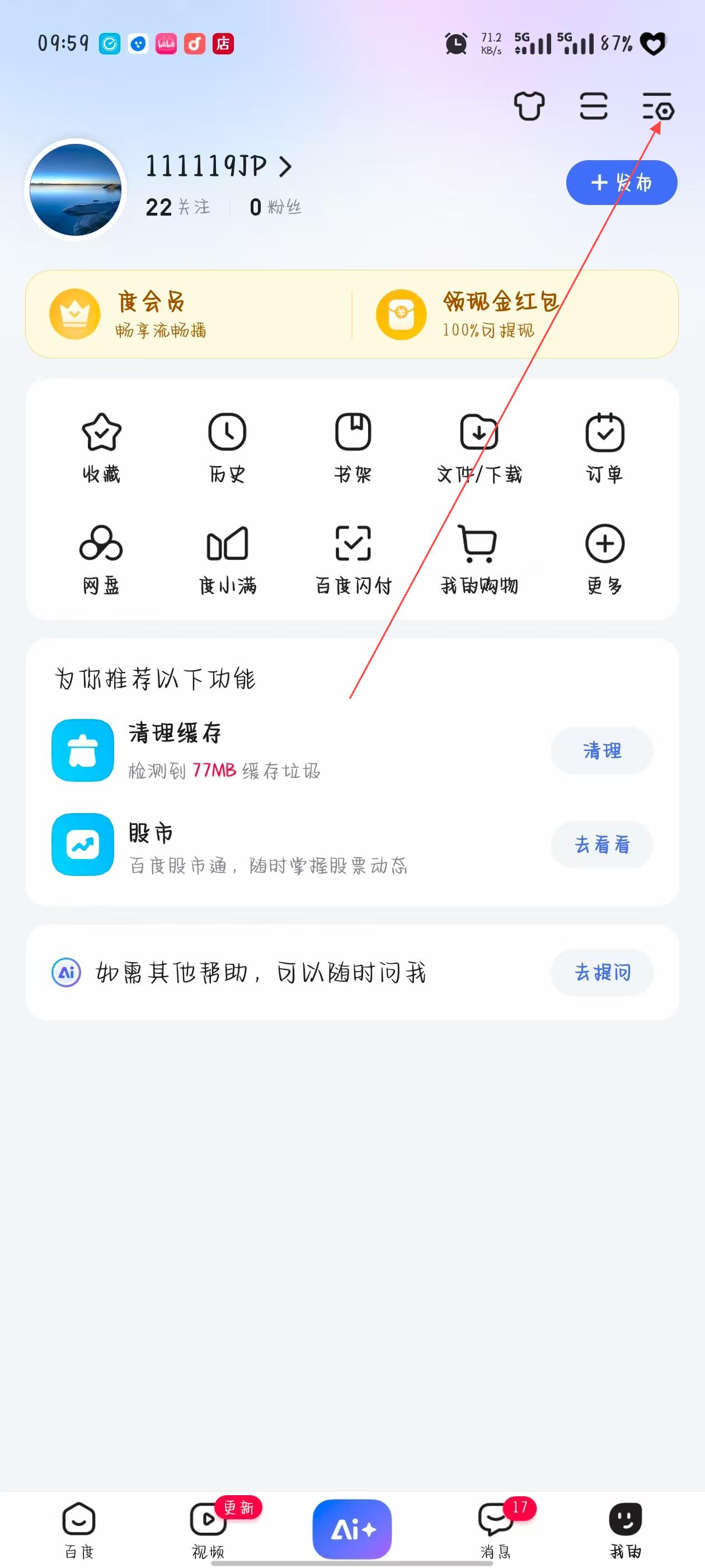 1、打开百度应用并进入我的页面,点击右上角的功能菜单按钮。