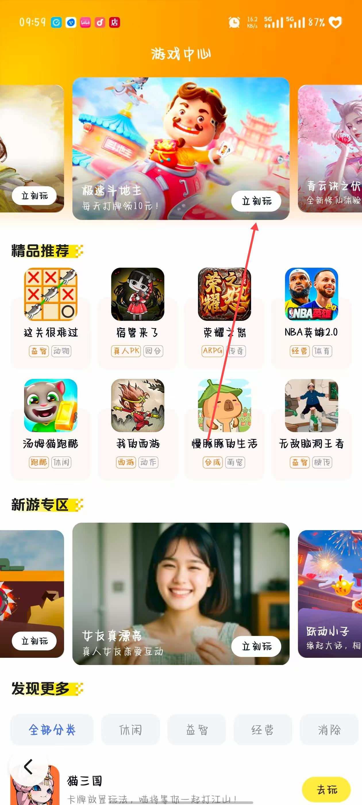 3、进入游戏中心页面后,可以看到各种游戏推荐,包括精品推荐、新游专区等板块,选择感兴趣的游戏,点击游戏对应的立刻玩按钮,即可开始秒玩游戏。