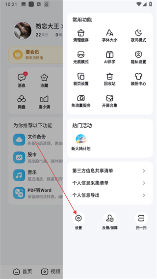 2、在展开的列表中,找到设置并点击,进入百度的设置界面。