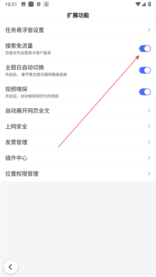 4、在扩展功能页面中找到搜索免流量对应的开关,点击该开关即可。