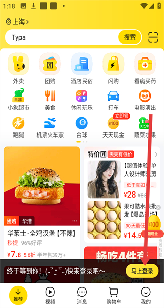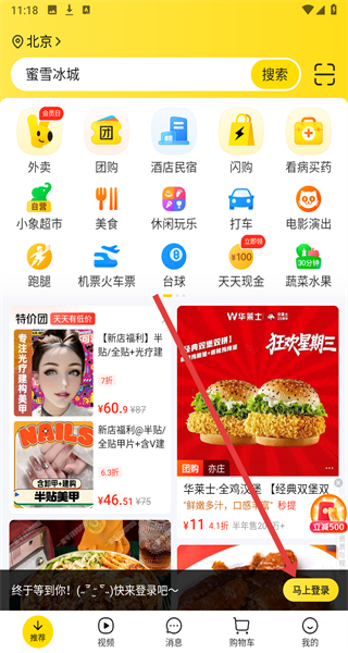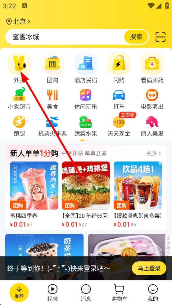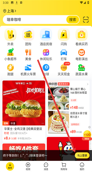 4、回到主界面后点击“马上登录”,进入登录流程,登录完成后即可开始点外卖。