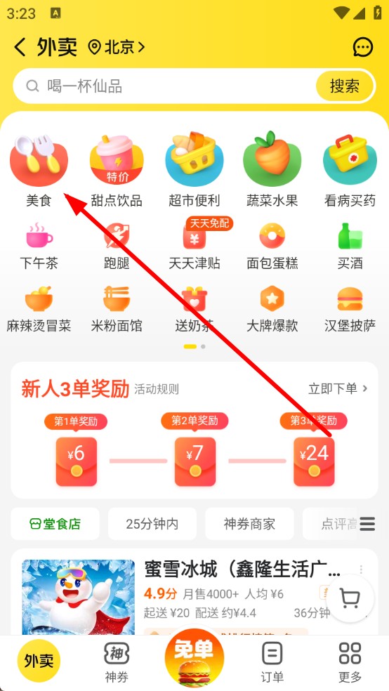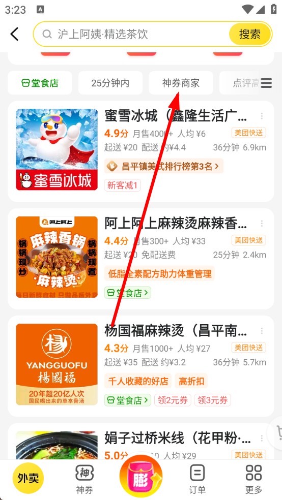 3、进入商家列表,点「神券商家」筛选,或其他类目进行选择,选择自己喜欢的食物进行购买。
