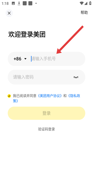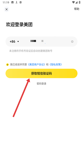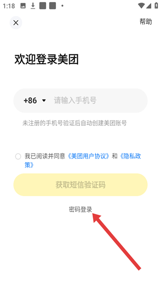 3、在密码登录页面输入手机号和密码,勾选“我已阅读并同意《美团用户协议》和《隐私政策》”。