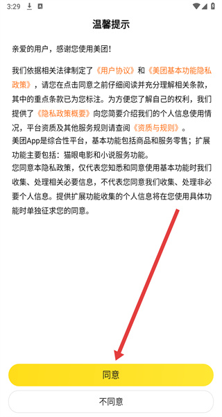 1、点击“温馨提示”的“同意”,进入美团主界面。