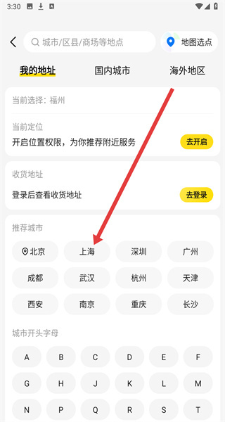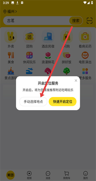 2、主界面弹出“开启定位服务”弹窗,选择“手动选择地点”,进入地址选择页面。