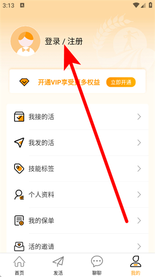 2、在个人中心页面,点击登录注册,进入登录界面。