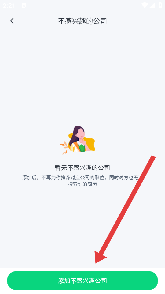 3、在不感兴趣的公司页面点击底部添加不感兴趣公司的按钮,搜索并选择之前的公司进行添加,即可屏蔽该公司。
