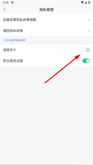 4、在隐私管理页面将屏蔽中介功能的开关打开,即可屏蔽中介信息。