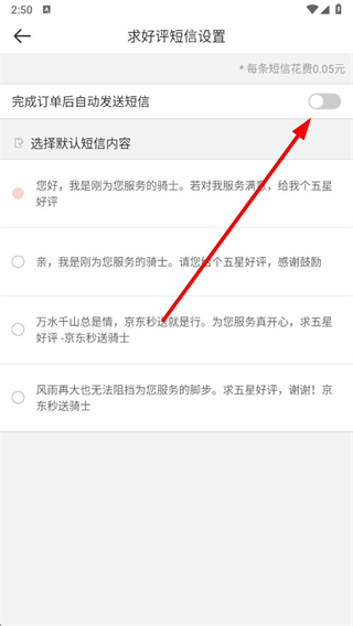 4、在页面打开完成订单后自动发送短信的开关,再选择默认短信内容,后续完成订单后会自动发送好评短信。