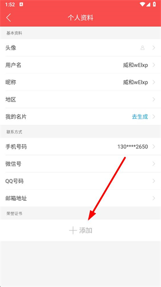 3、在个人资料页面找到荣誉证书板块,点击下方的添加按钮。