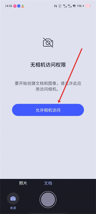 2、页面提示无相机访问权限,点击允许相机访问按钮,授予应用相机权限。