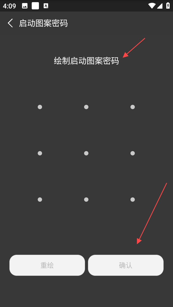 3、在绘制启动图案密码界面,按照个人需求在九宫格上绘制图案密码,绘制完成后点击确认按钮,若绘制有误,可点击重绘按钮重新绘制。