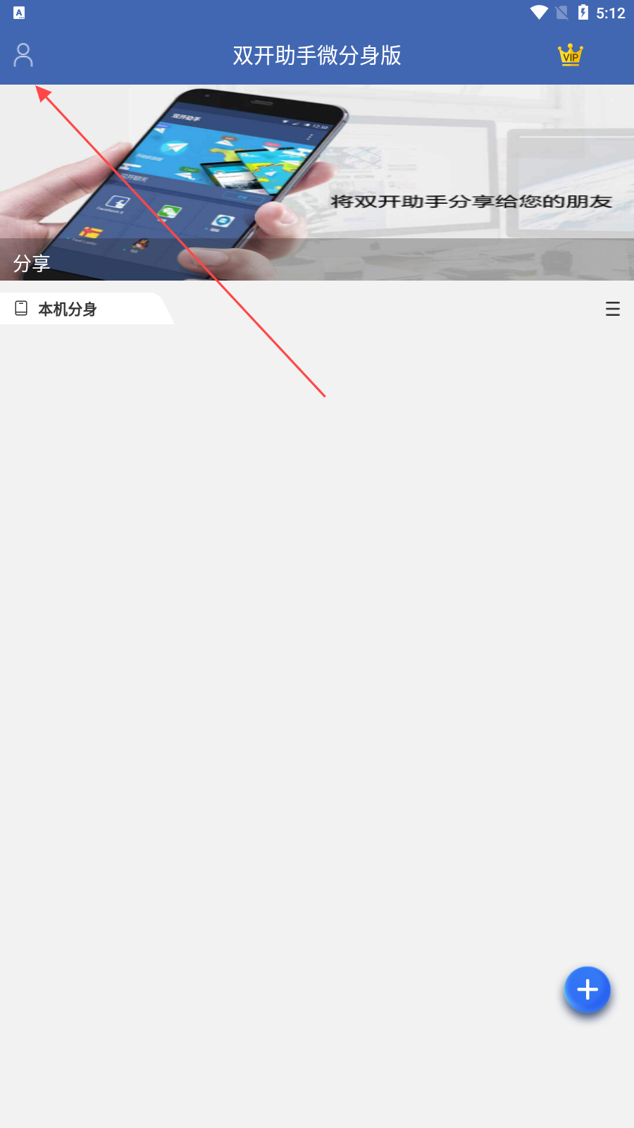 1、打开双开助手这个应用,看到主界面的左上角,点击左上角的头像图标,进入个人中心页面。