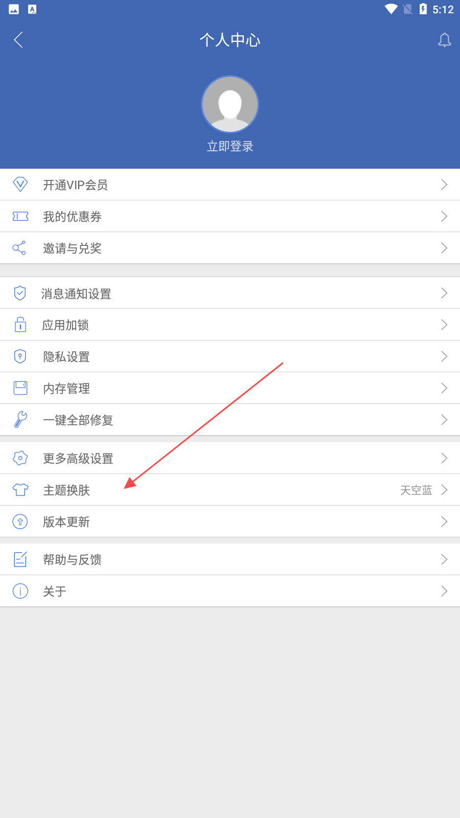 2、进入个人中心,在个人中心页面中,找到主题换肤的选项并点击进入主题换肤的界面。