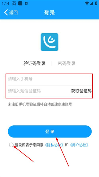 3、在登录页面输入手机号、获取并填写验证码,勾选同意协议后点击登录。