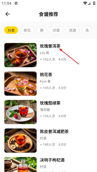 2、在食谱推荐页面,点击玫瑰普洱茶,进入该食谱的详情页面。