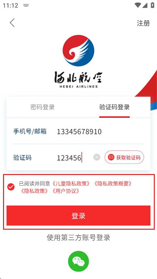 4、填写收到的验证码,勾选相关协议选项,点击登录按钮完成河北航空账户登录。
