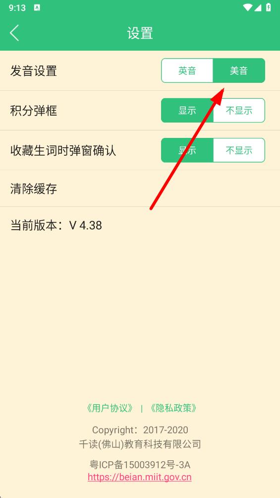 4、根据需求点击英音或美音对应的按钮,即可完成发音设置。