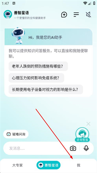 1、打开大专家App的善智星语页面,点击底部的我选项,进入个人中心页面。