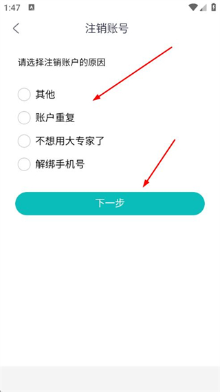 5、在注销账号页面选择注销账户的原因,点击下一步。