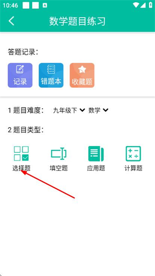 2、在数学题目练习页面选择类型,进入答题练习页面。