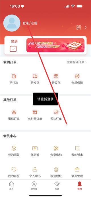 2、在个人中心页面,点击登录注册,进入登录界面。