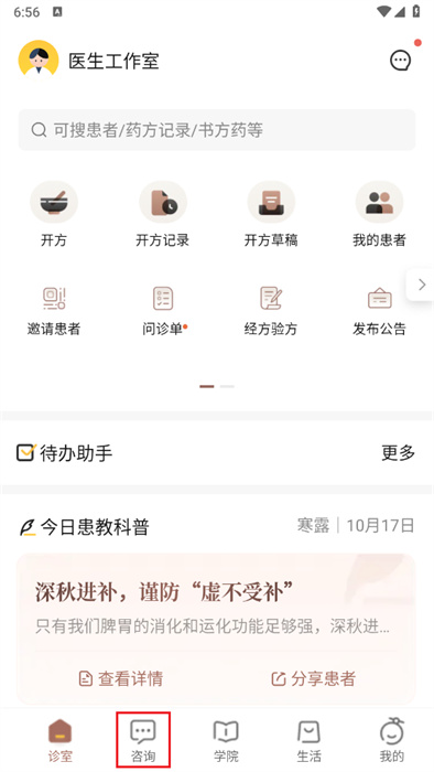 3、屏幕下方有一个【资讯】栏,在该栏中,医生将可以和自己的患者进行沟通;