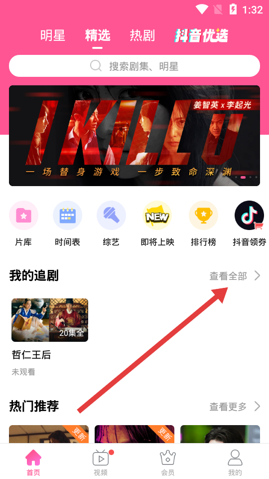 1、打开韩剧TVAPP后,在首页找到我的追剧板块,点击查看全部,进入观看记录页面。