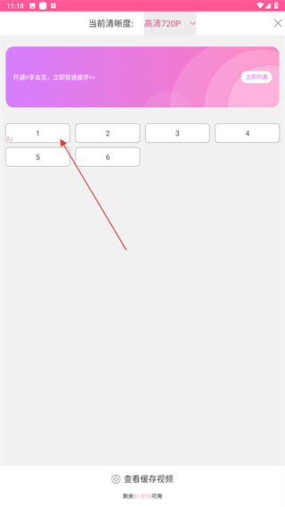 3、进入缓存的界面内,选择清晰度后再点击要缓存的集数。