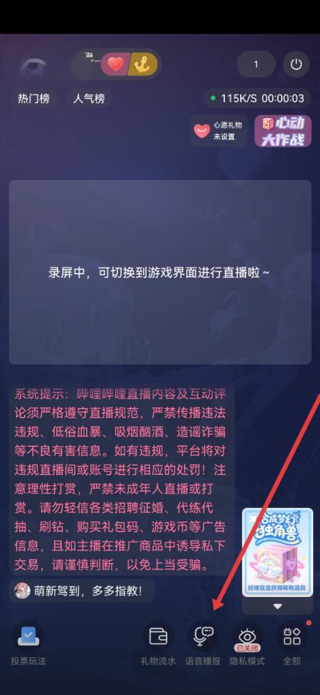 3、进入哔哩哔哩的直播界面后,需要点击底部的语音播报选项。