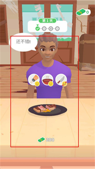4、完成制作后,将牛排呈上,获取对应的评价和200的奖励,结束本次制作。