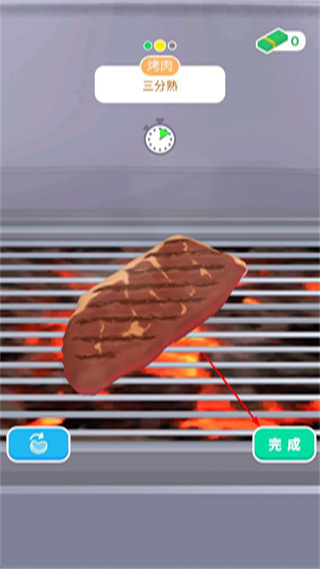 3、进入烤肉环节后,待牛排烤至三分熟状态,点击界面右下角的完成按钮。