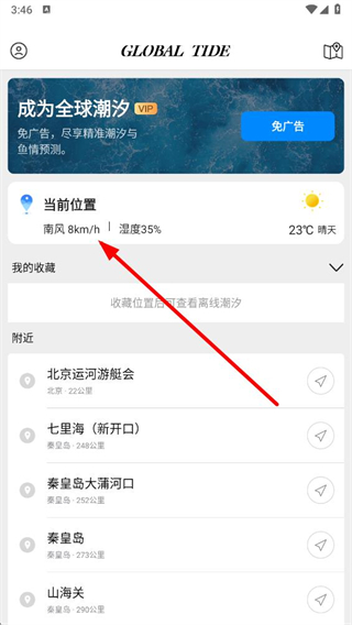 1、打开全球潮汐app,在主界面中找到当前位置板块,点击进入。