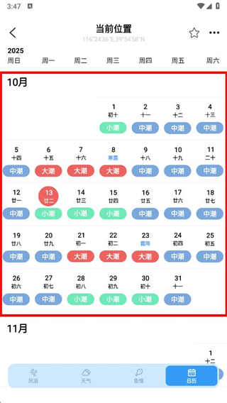 3、在日历界面中,可看到不同日期标注的潮汐情况,标识了小潮、中潮、大潮等信息。