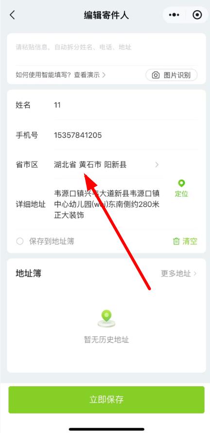 2、进入编辑寄件人页面,填写姓名、手机号、省市区及详细地址等寄件人信息,点击立即保存。