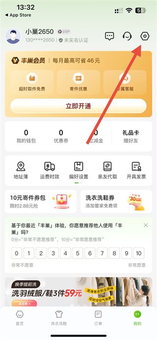 1、在丰巢app我的页面点击右上角设置图标,进入设置页面。