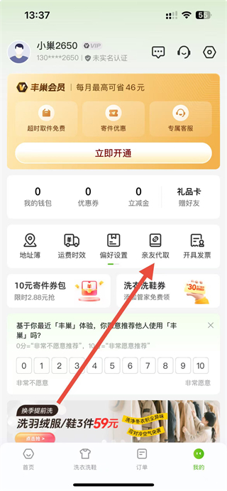 2、在个人页面点击亲友代取选项,进入亲友代取页面。